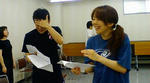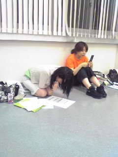 写真は休憩時間の人々。クール三浦氏、ビューティ堀田嬢、劇団員の金沢。